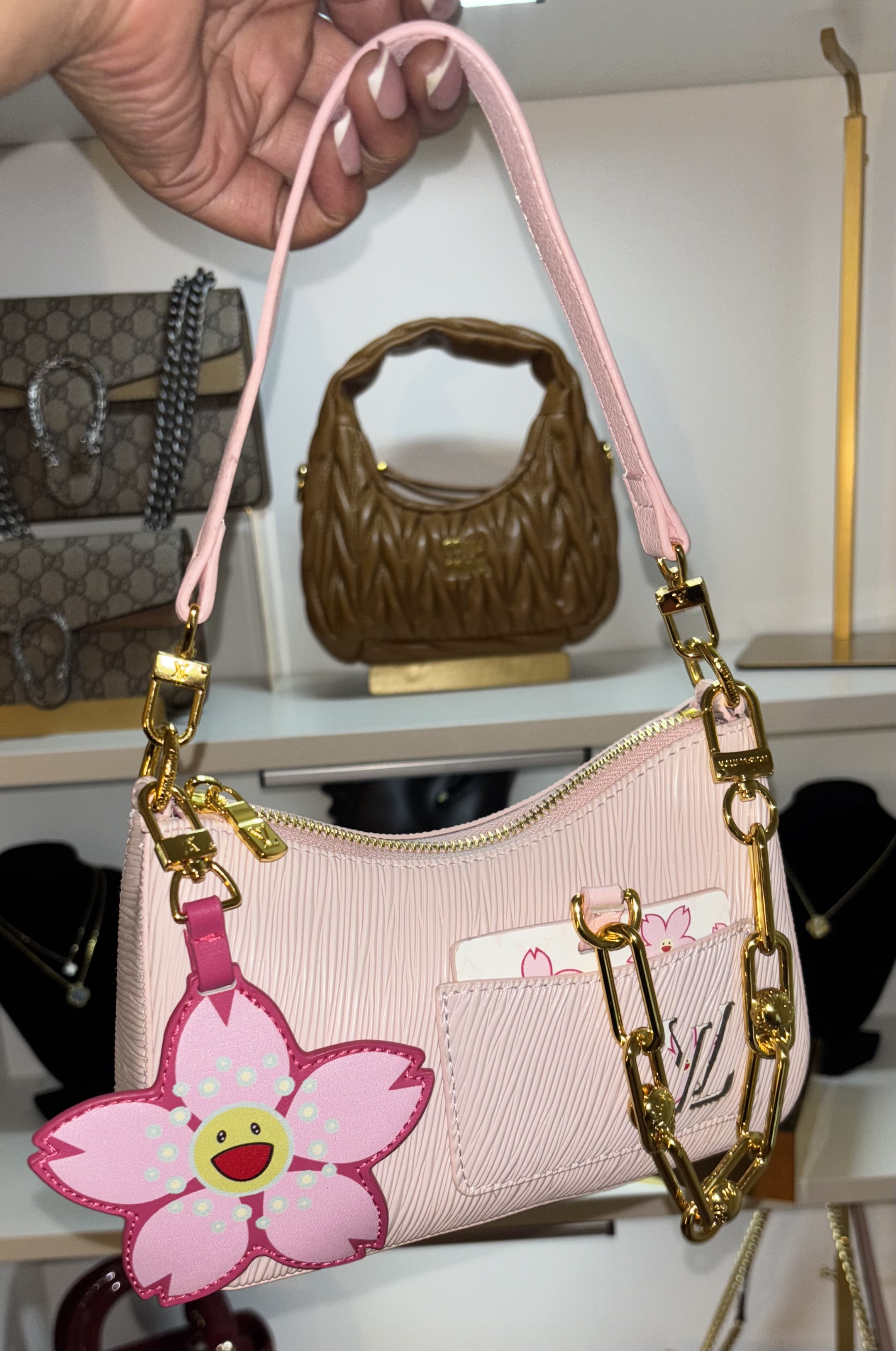 This bag is so cute. Very, very similar to the real one. It is missing the mirror that goes in the pocket. I wish that it did have that feature. And the flower keychain is made with a different material than the original. But it’s still cute and very wearable.