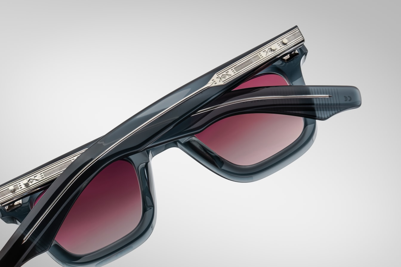Sharp, Wellington-shaped spectacles with a '50s-inspired silhouette, featuring exposed wirecore temples with intricate Native American-inspired designs.