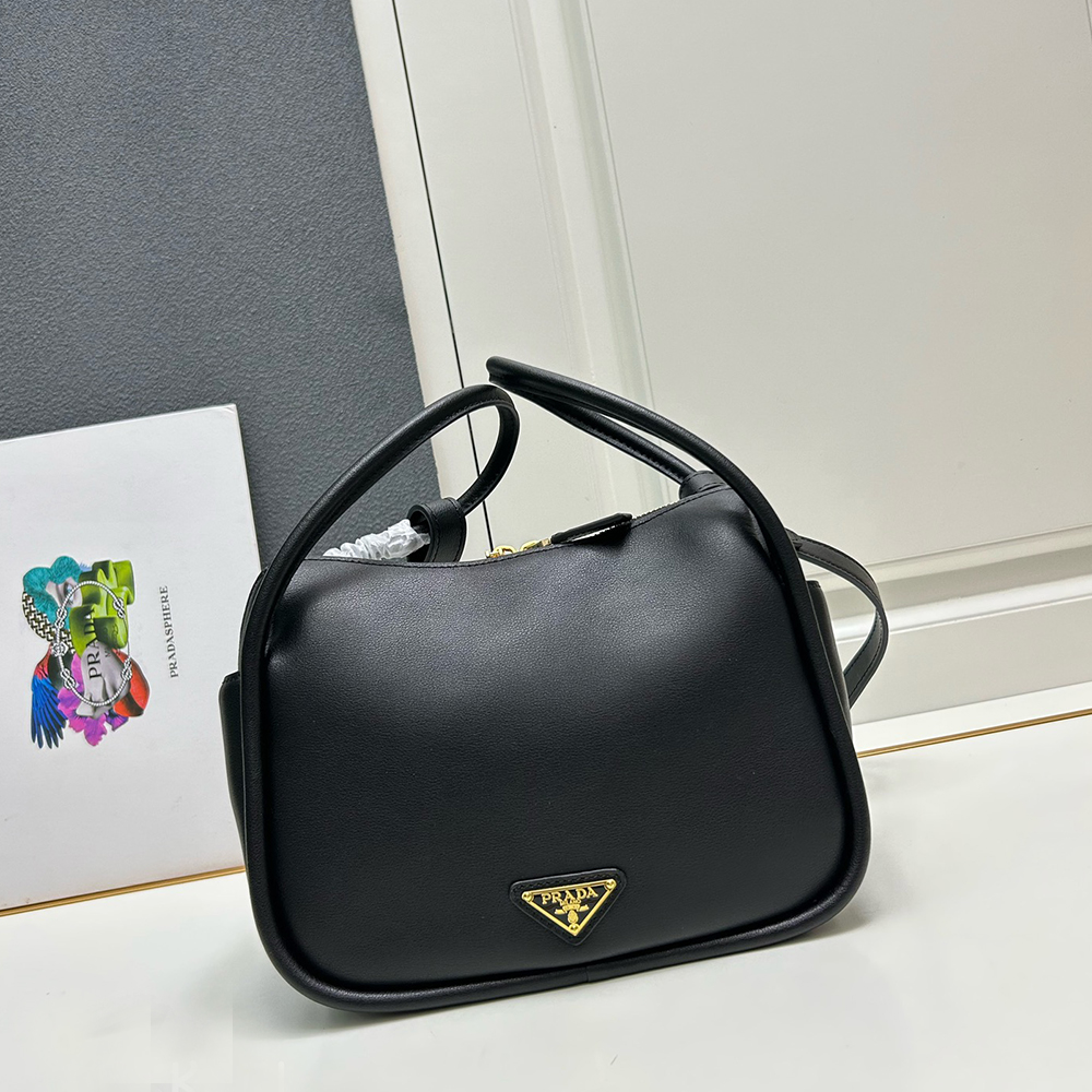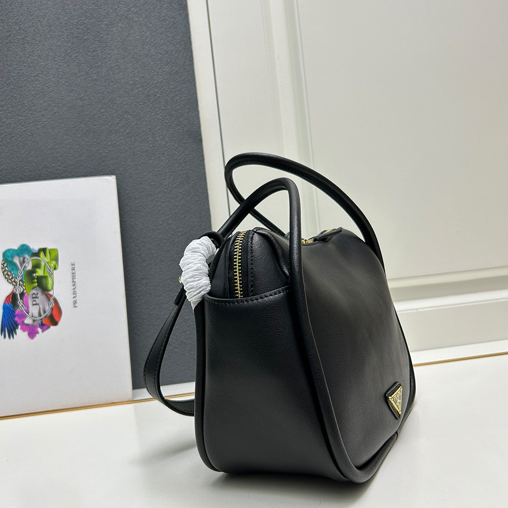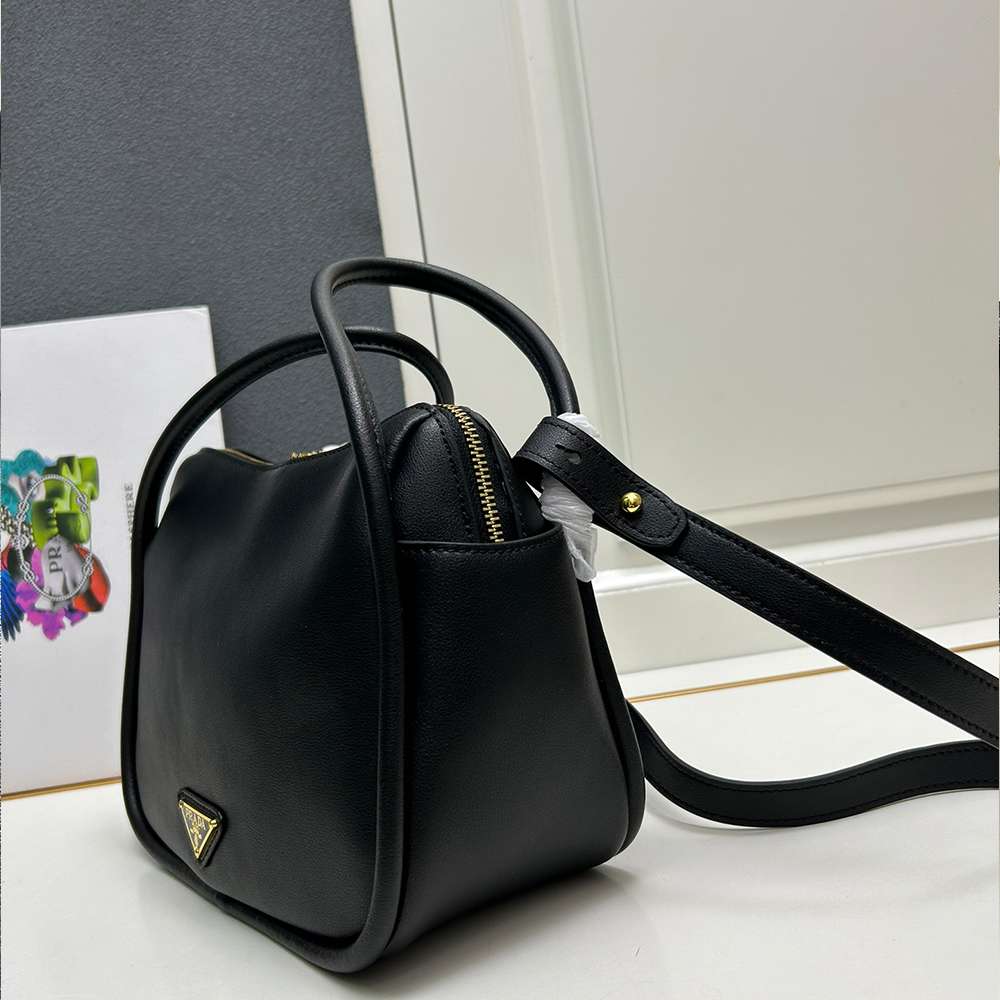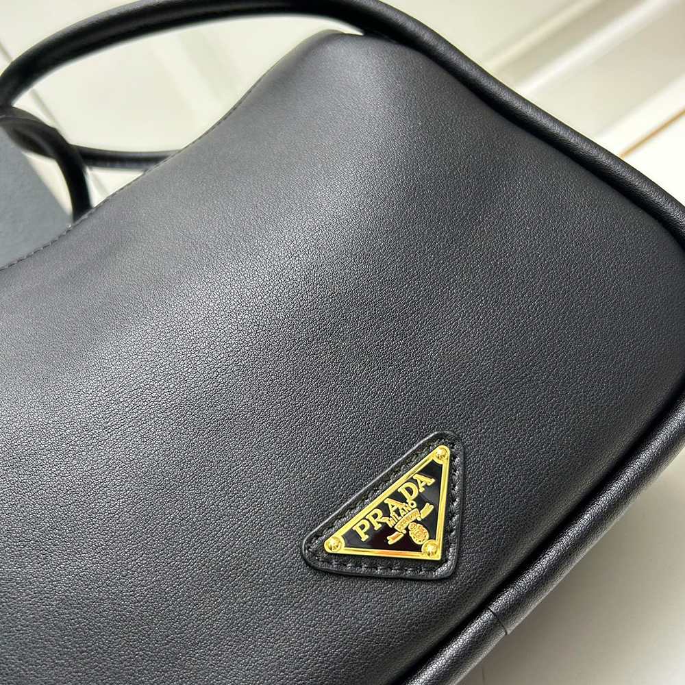 A contemporary design with a casual attitude defines this handbag with refined details illuminated by metal hardware. The compact and versatile style features clean, minimalist lines emphasized by the buttery touch of soft grain leather. The accessory, an expression of exceptional artisanal know-how, is decorated with the enameled metal triangle logo.