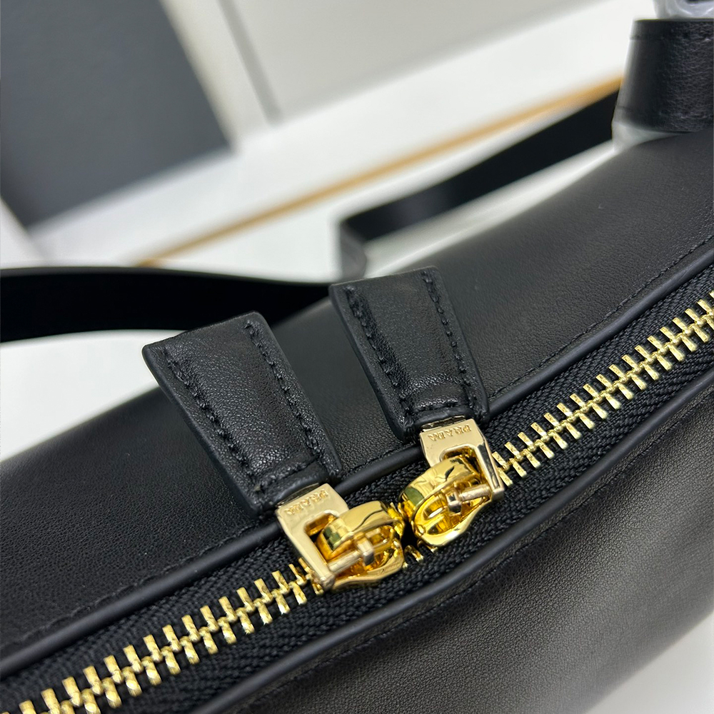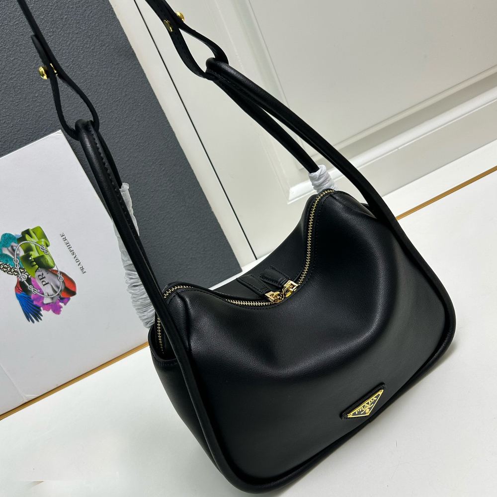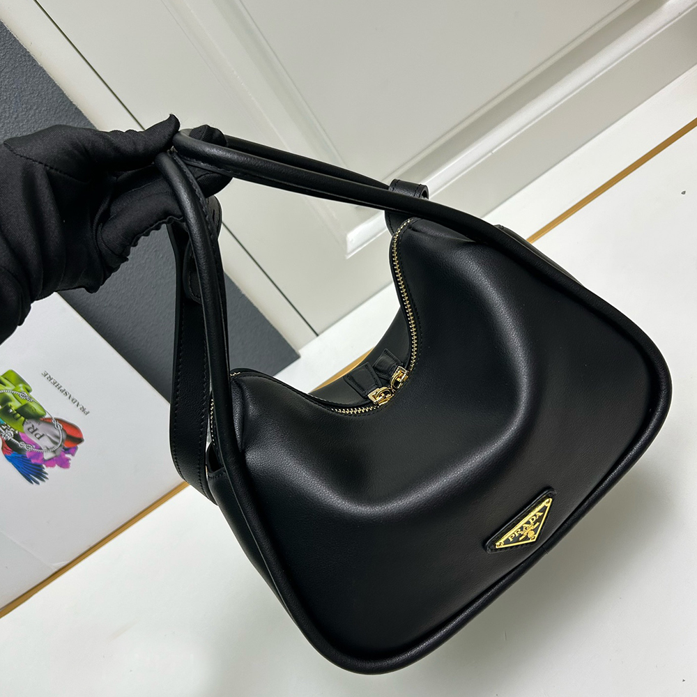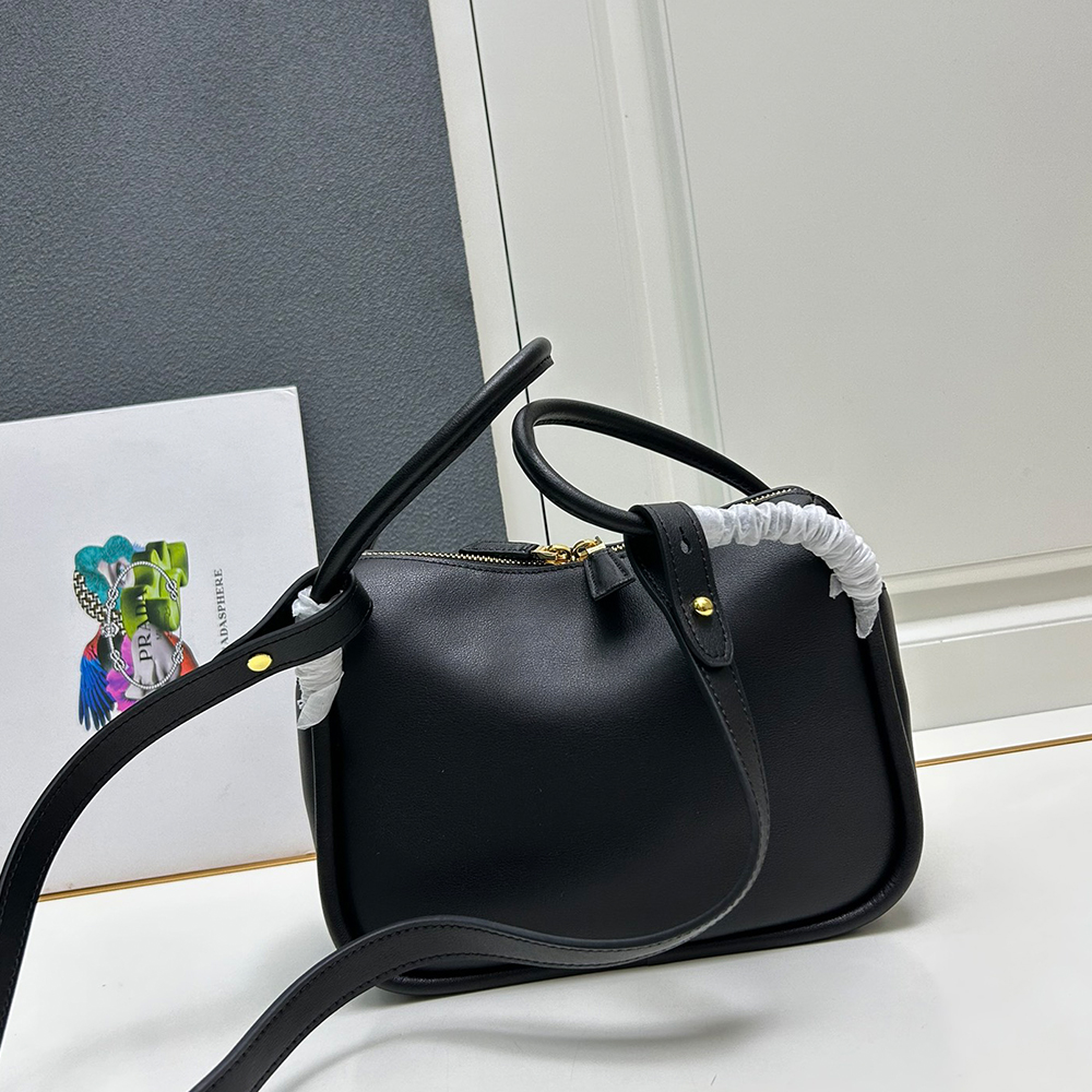 A contemporary design with a casual attitude defines this handbag with refined details illuminated by metal hardware. The compact and versatile style features clean, minimalist lines emphasized by the buttery touch of soft grain leather. The accessory, an expression of exceptional artisanal know-how, is decorated with the enameled metal triangle logo.